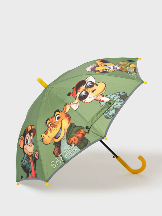 Зонт-трость для мальчика с героями сафари. Зонт идеально сочетается с резиновыми сапогами из коллекции. По краю зонта имеется светоотражающая окантовка, поэтому в темное время суток ребенка с зонтом хорошо видно на дороге.  Длина 67 см, диаметр купола 76 см. Механизм складывания - полуавтомат.