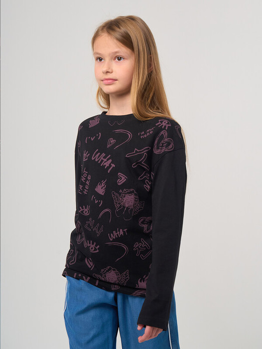 Трикотажный лонгслив с контрастным принтом в трендовой эстетике «кавайи» (с яп. «милый»). Круглый вырез горловины в рубчик. Длинный рукав.Изделие из 100% хлопкового материала, который дарит ощущение приятных прикосновений. Размерный ряд 128 – 176 см.