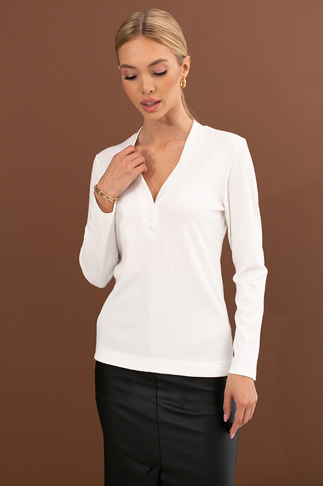 Джемпер полуприлегающего силуэта из эластичного полотна в рубчик. Втачной длинный рукав. V-образный вырез горловины, оформлен бейкой и украшен пуговицами.