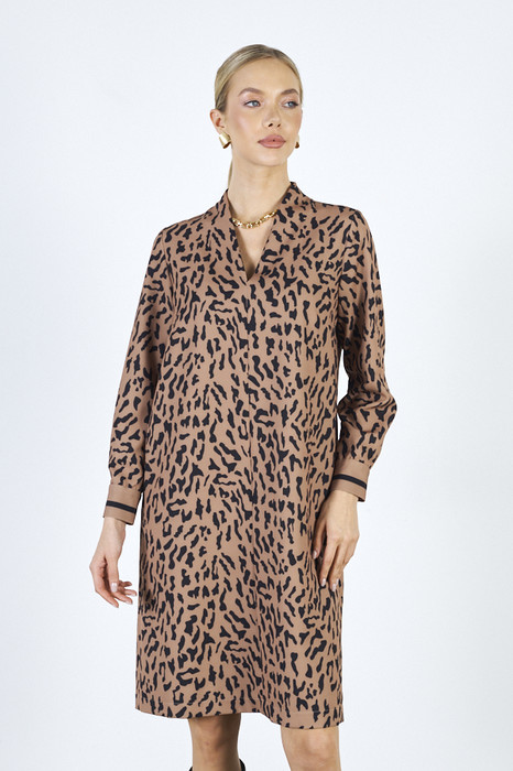 Платье свободного силуэта из плательной ткани. По центру передней части изделия выполнен шов. Цельнокроеная стойка, переходящая в V-образный вырез горловины, визуально делает фигуру стройнее. Втачной длинный рукав. Низ рукава на манжете с застёжкой на пуговицы-жемчужины.