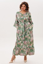 Платье свободного силуэта из плательной ткани. Изделие отрезное по линии талии, с ярусами на юбке. Втачной рукав в романтическом стиле, присборен на резинку. V-образный вырез горловины с декоративной завязкой. В комплекте пояс из основной ткани. В таблице размеров представлены параметры человека, а не изделия.