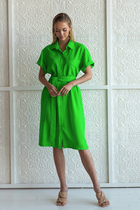 Платье -рубашка из вискозной ткани с крэш-эффектом. Свободный силуэт с застёжкой на планке. Вырез горловины обработан отложным воротником на стойке. Короткий рубашечный рукав с отворотом. На задней части изделия выполнена кокетка с небольшой складкой. На передней-накладной карман в области груди. В комплекте пояс из основной ткани.