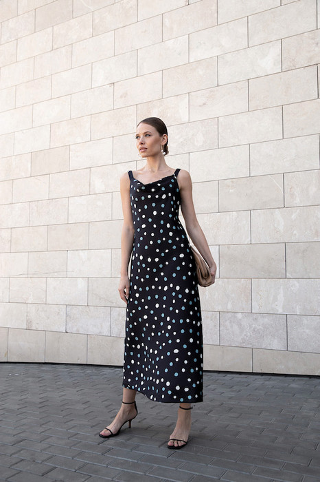 Платье с «качелями» в зоне декольте смотрится очень женственно. Изделие на бретелях полуприлегающего силуэта, расширенное книзу из атласной плательной ткани.