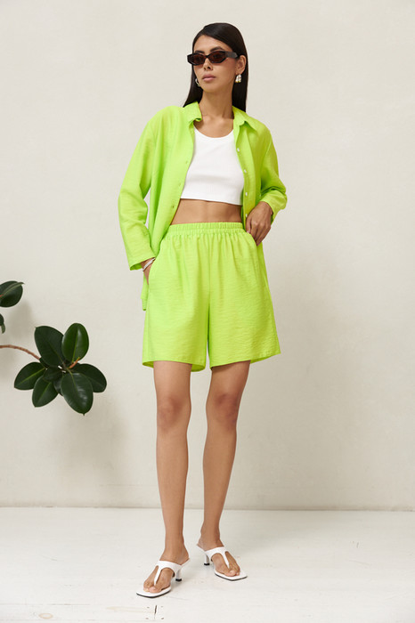Шорты свободного силуэта из вискозной ткани с крэш-эффектом. Пояс притачной с эластичной резиной, в боковых швах карманы.