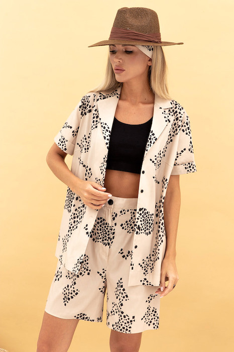 Блуза свободного силуэта с застёжкой на пуговицы из вискозной ткани. Втачной короткий рукав с отворотом. Вырез горловины оформлен английским воротником, который визуально сделает фигуру стройнее и подчеркнет красивую линию груди. В комплекте пояс из основной ткани.