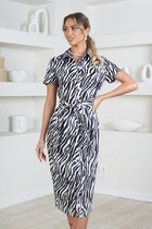 Платье приталенного силуэта из вискозной плательной ткани. Изделие отрезное по линии талии с защипами. В боковых швах карманы. Втачной короткий рукав. Притачная планка с застёжкой на пуговицы. Вырез горловины обработан отложным воротником на стойке. В комплекте пояс из основной ткани.