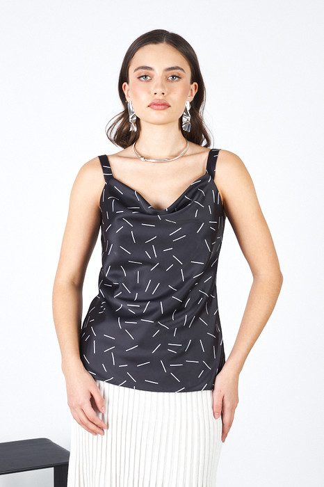 Топ с «качелями» в зоне декольте смотрится очень женственно. Изделие на бретелях полуприлегающего силуэта из атласной блузочной ткани.