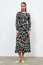 Платье свободного силуэта из вискозной ткани с крэш-эффектом. Изделие отрезное по линии талии, с ярусами на юбке. Лиф с застёжкой на пуговицы. Вырез горловины обработан отложным воротником на стойке. Втачной рукав на манжете с застёжкой на пуговицы. В комплекте пояс из основной ткани. В таблице размеров представлены параметры человека, а не изделия.