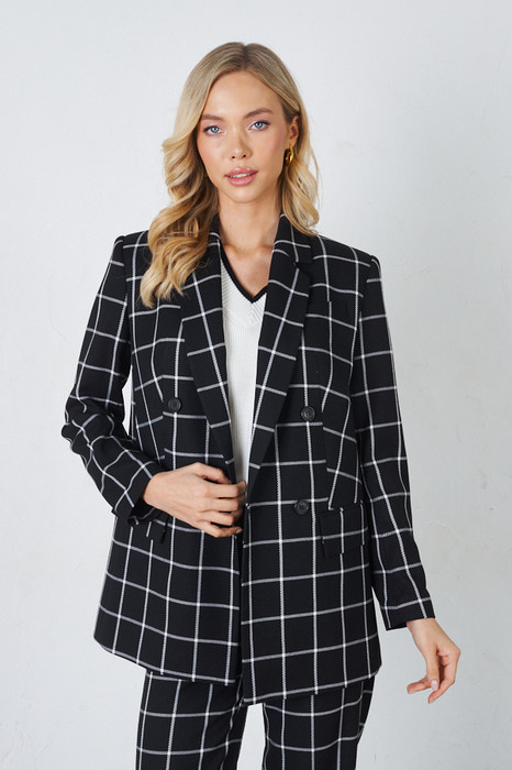 Двубортный жакет из костюмной ткани. Изделие полуприлегающего силуэта с английским воротником и застежкой на пуговицы. На передней части жакета выполнен нагрудный карман с листочкой и карманы в рамку с клапаном. По центру задней части выполнена шлица - элемент декоративный и необходимый. Обеспечивает свободу движения, добавляет шику и элегантности. Втачной длинный рукав, снизу имитация шлицы с пуговицами. Изделие идеально держит форму, имеет четкую линию плеча благодаря плечевым накладкам. Жакет на подкладке.