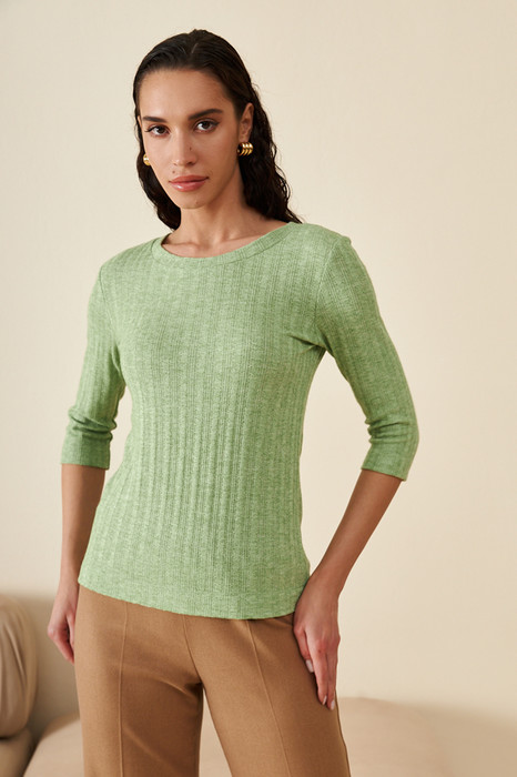 Джемпер прилегающего силуэта из фактурного эластичного полотна. Втачной рукав 3/4. Круглый вырез горловины оформлен бейкой.