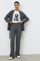 Брюки выполнены из эластичного полотна. Брюки прямого силуэта. Пояс притачной с эластичной резиной. На передней части брюк застрочены стрелки.