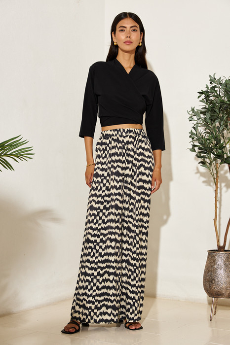 Брюки прямого свободного силуэта из вискозной ткани с сатиновым блеском. Пояс притачной с эластичной резиной, в боковых швах карманы.