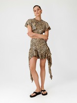 Платье из эластичного полотна. Изделие свободное в верхней части и прилегающее в области талии и бёдер. Лиф изделия оригинального кроя в стиле кимоно. Цельнокроеная стойка переходящая в запах, визуально делает фигуру стройнее. По центру задней части платья выполнен шов, снизу небольшой разрез. В комплекте пояс. В таблице размеров представлены параметры человека, а не изделия.