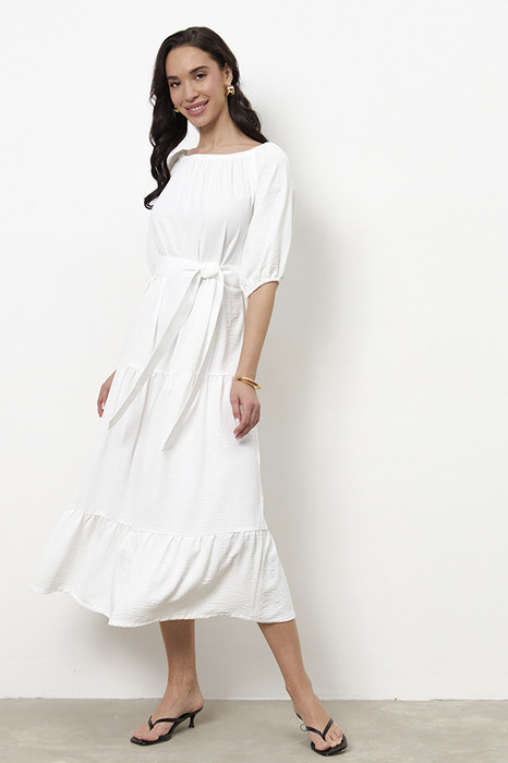 Платье свободного силуэта из ткани с крэш-эффектом, отрезное по линии талии. Нижняя части платья с воланами. Рукав-реглан до локтя. По низу рукава сборка на резину. Линия плеча и линия горловина оформлены сборкой на резину. В комплекте пояс из основной ткани.