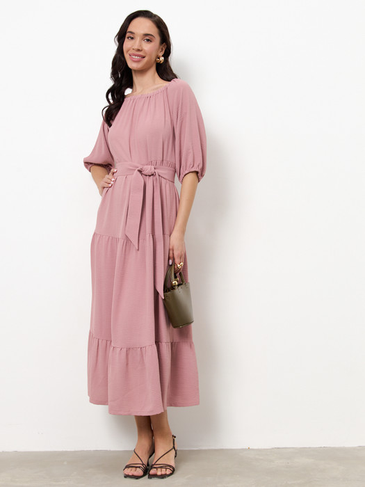 Платье свободного силуэта из ткани с крэш-эффектом, отрезное по линии талии. Нижняя части платья с воланами. Рукав-реглан до локтя. По низу рукава сборка на резину. Линия плеча и линия горловина оформлены сборкой на резину. В комплекте пояс из основной ткани.