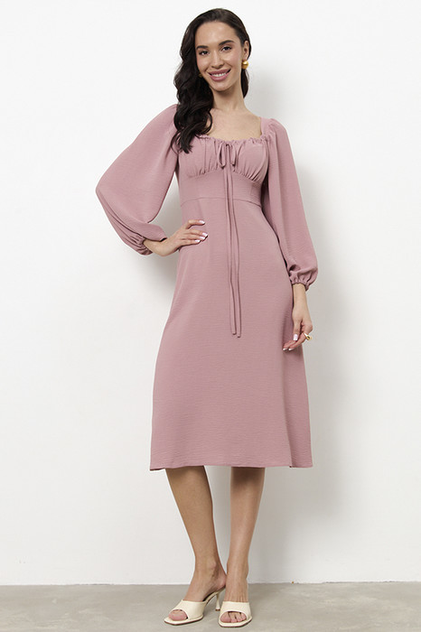 Платье приталенного силуэта, расширенное книзу из ткани с крэш-эффектом. Отрезное по линии талии. Верхняя часть с отрезным лифом, подрез фигурный. По верхнему краю лифа кулиска, в которую вставлены бретели-завязки, формирующие драпировку. Вырез горловины глубокий, расширенный, по форме напоминающий каре, с вырезом до линии подреза. Прилегание платья создано за счет рельефов на деталях переда и вытачек на деталях верхней и нижней части спинки. В верхней части среднего шва спинки застежка на потайную молнию. Рукава втачные, длинные, со сборкой по окату и низу рукава. В подгибку низа рукава вставлена резинка.