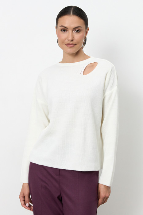 Джемпер свободного силуэта с декоративным вырезом в области плеча. Рукав втачной в спущенную пройму. Изделие выполнено из мягкой структурированной пряжи.