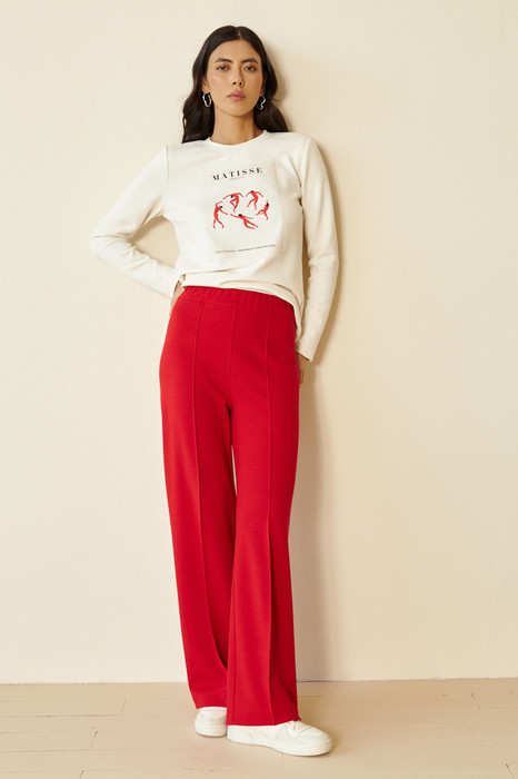 Брюки прямого силуэта из эластичного полотна. Пояс притачной с эластичной резиной. На передней части брюк застрочены стрелки.