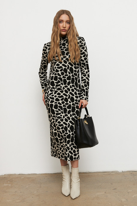 Платье полуприлегающего силуэта из эластичного полотна с жаккардовым узором. Вырез горловины оформлен воротником-стойкой. Втачной длинный рукав.