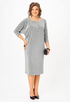 Платье полуприлегающего силуэта, расширенное книзу из эластичного полотна с жаккардовым узором. Боковые швы смещены в сторону переда. На передней части, ниже линии груди, выполнены рельефы. Линия рельефа начинается от выреза горловины и заканчивается в боковом шве на уровне выше линии талии. V- образный вырез горловины. Спинка со средним швом и талиевыми вытачками. Втачной длинный рукав.