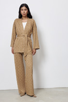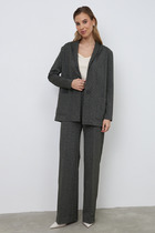 Брюки, зауженные в области колена и расклешённые книзу из костюмной ткани. На задней части брюк по талии выполнены две вытачки. На передней части застрочены стрелки. Брюки без пояса на обтачке. В боковом шве потайная молния. Низ брюк оформлен широкой подгибкой.