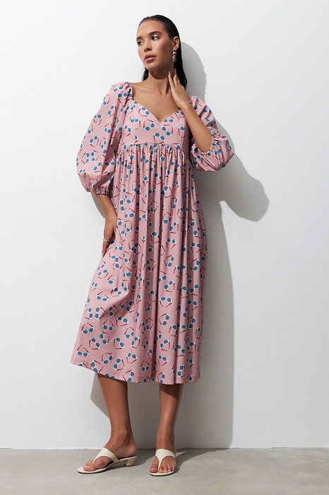 Платье свободного силуэта из вискозной ткани. Изделие отрезное по линии талии. Линия талия завышена и фигурная. Верхняя часть юбки со сборкой. По среднему шву спинки потайная молния. Лиф переда и спинки двухслойный, имеет рельефные швы. Окат рукава и низ рукава зафиксированы резиной.