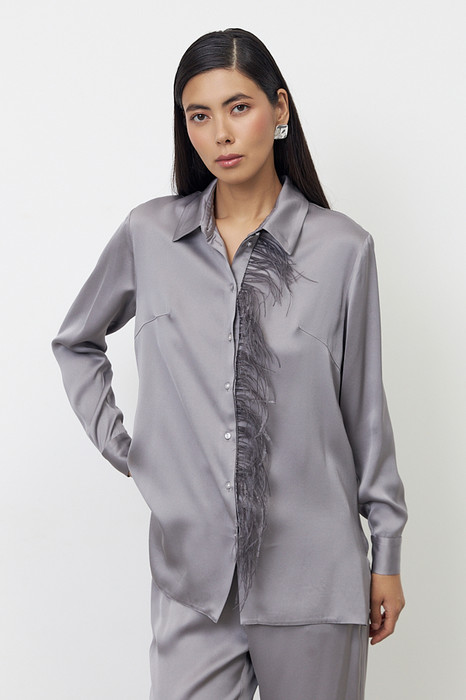 Блуза из вискозной ткани с сатиновым блеском. Свободный силуэт с разрезами в боковых швах и застёжкой на пуговицы. На задней части изделия выполнена кокетка с небольшой складкой. Вырез горловины обработан отложным воротником на стойке. Втачной рукав на манжете с застёжкой на пуговицы. Изделие украшено съемной планкой с перьями. Перед стиркой планку с перьями необходимо снять.