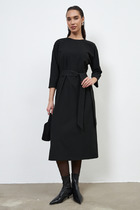 Платье из вискозной ткани с крэш-эффектом. Полуприлегающий силуэт, с разрезом в боковом шве. По среднему шву спинки застёжка на петлю-пуговицу. Круглый вырез горловины и линия проймы окантованы косыми бейками из основной ткани.