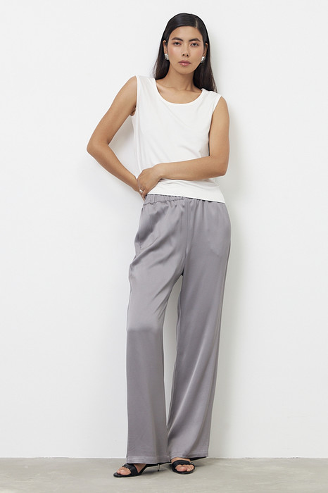 Брюки прямого силуэта из вискозной ткани с сатиновым блеском. Пояс притачной с эластичной резиной, в боковых швах карманы.