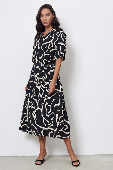 Платье полуприлегающее в области груди и свободное в области бедер из вискозной ткани. Изделие отрезное по линии талии. Лиф с застёжкой на пуговицы. Вырез горловины обработан отложным воротником на стойке. Втачной короткий рукав. В комплекте пояс из основной ткани.