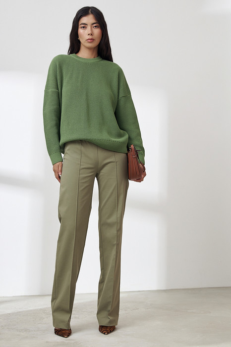 Брюки прямого силуэта из хлопковой ткани. Пояс притачной с эластичной резиной. На передней части брюк застрочены стрелки.