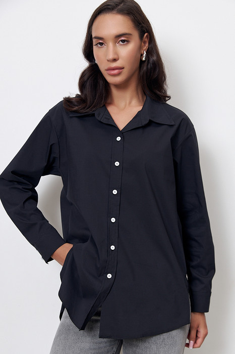 Рубашка из хлопковой ткани свободного силуэта с застёжкой на планке. Низ изделия асимметричной длины (спинка удлинена относительно переда) с закруглениями по бокам. Вырез горловины обработан отложным воротником на стойке. Рубашечный рукав на манжете с застёжкой на пуговицы. На задней части изделия выполнена кокетка с небольшой складкой. Достоинство этой модели - в способности скрыть некоторые недостатки фигуры. Её можно сочетать как с брюками, так и с джинсами.