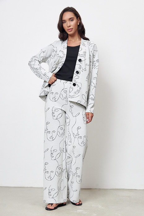 Костюм выполнен из фактурного эластичного полотна. Брюки прямого силуэта. Пояс притачной с эластичной резиной. Кардиган свободного силуэта с притачной планкой и застёжкой на пуговицы. Втачной длинный рукав в спущенную пройму.