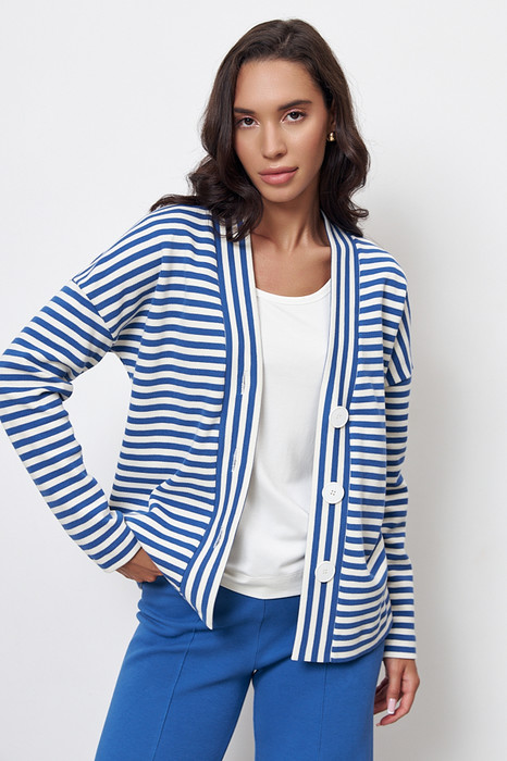 Кардиган из эластичного полотна свободного силуэта. Втачной длинный рукав в спущенную пройму. Линия борта обработана притачной планкой с застёжкой на пуговицы.