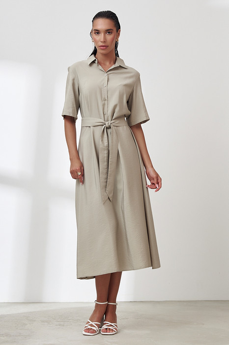 Платье из вискозной ткани с крэш-эффектом полуприлегающее в области груди и свободное в области бедер. Изделие отрезное по линии талии. Лиф с застёжкой на пуговицы. Вырез горловины обработан отложным воротником на стойке. Втачной короткий рукав. В комплекте пояс из основной ткани.