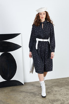Платье из хлопковой ткани отрезное по линии талии. Изделие прилегающего силуэта в области груди и свободного кроя в области бёдер, с карманами в боковых швах. Линия талии завышена. На полочке нагрудная вытачка переведена в широкий цельнокроеный пояс, завязывающийся сзади. На спинке — талиевые вытачки. Глубокий V-образный вырез горловины. Застёжка на пуговицы в нижней части платья. Рукав втачной, собран по окату и по низу рукава в густую сборку. Низ рукава обработан манжетой.