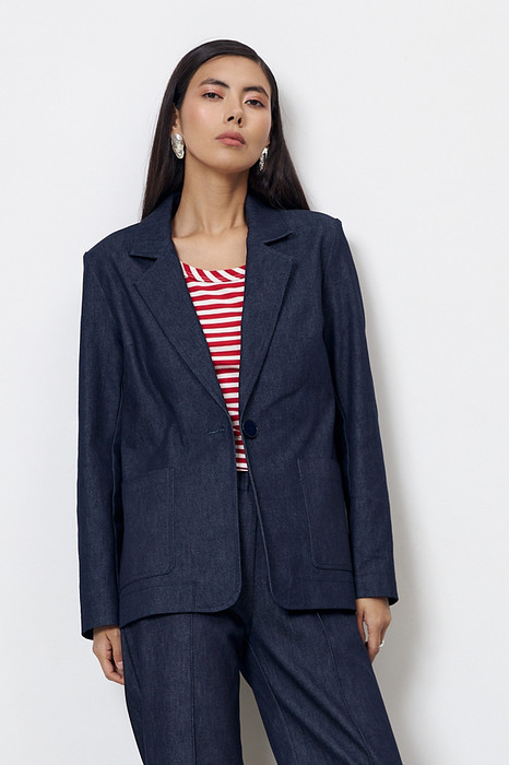 Жакет прямого силуэта с английским воротником из хлопковой ткани. На передней части жакета застежка на пуговицу и накладные карманы. Втачной длинный рукав. Изделие имеет четкую линию плеча благодаря плечевым накладкам.