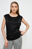 Топ из эластичного полотна полуприлегающего силуэта. Линия горловины и линия проймы окантованы эластичной бейкой.