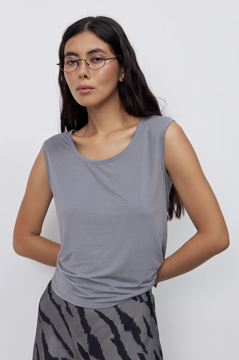 Топ из эластичного полотна полуприлегающего силуэта. Линия горловины и линия проймы окантованы эластичной бейкой.