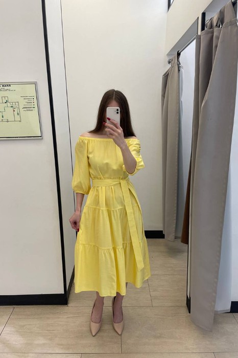 Платье свободного силуэта из вискозной ткани, отрезное по линии талии. Нижняя части платья с воланами. Рукав-реглан до локтя. По низу рукава сборка на резину. Линия плеча и линия горловина оформлены сборкой на резину. В комплекте пояс из основной ткани.
