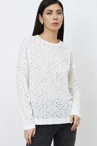 Джемпер прилегающего силуэта из эластичного полотна в рубчик. V-образный вырез горловины и линия проймы оформлены бейками.