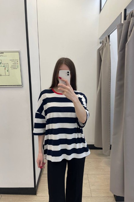 Джемпер из эластичного полотна. Свободный силуэт со спущенной линией плеча и коротким рукавом. Вырез горловины окантован эластичной бейкой. В таблице размеров представлены параметры человека, а не изделия.