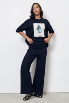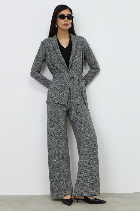 Костюм из эластичного полотна. Брюки прямого силуэта. Пояс с эластичной резиной. На передней части брюк застрочены стрелки. Жакет прямого свободного кроя с женственным шалевым воротником. На передней части изделия накладные карманы. Втачной рукав. В комплекте пояс из основной ткани, позволяющий создавать приталенный силуэт. Изделие с плечевыми накладками, которые при желании можно убрать.