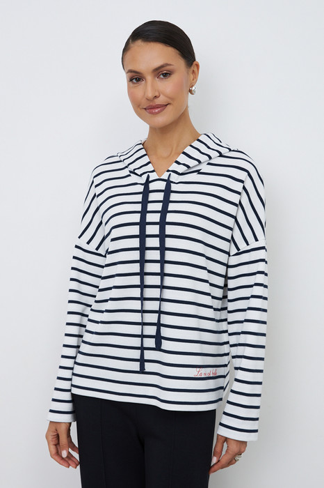 Худи с капюшоном из эластичного полотна. Изделие свободного силуэта со спущенной линией плеча и длинным рукавом. В таблице размеров представлены параметры человека, а не изделия.