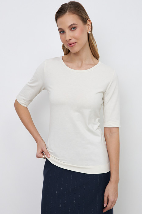 Джемпер из эластичного полотна прилегающего силуэта. Втачной короткий рукав. Круглый вырез горловины окантован эластичной бейкой. Женский джемпер стал незаменимой и популярной разновидностью одежды, которая может применяться буквально во всех случаях жизни.