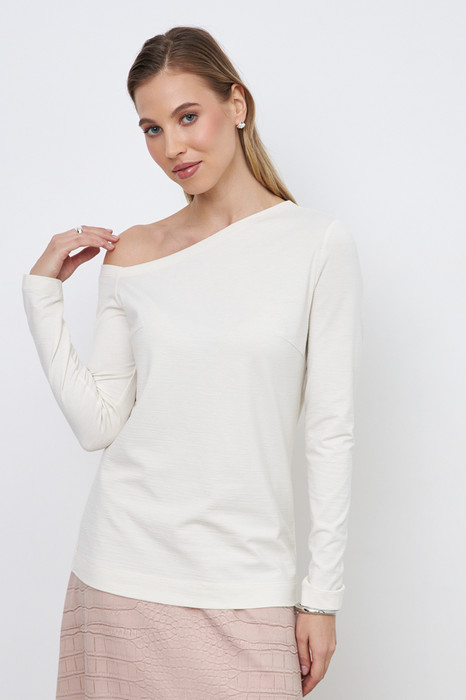 Джемпер из эластичного полотна полуприлегающего силуэта. Вырез горловины имеет асимметричную форму. Один рукав втачной, другой-типа реглан.