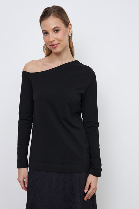 Джемпер из эластичного полотна полуприлегающего силуэта. Вырез горловины имеет асимметричную форму. Один рукав втачной, другой-типа реглан.