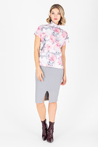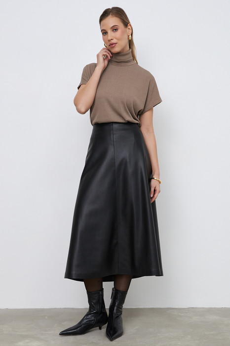 Юбка из эластичного полотна, с покрытием, имитирующим кожу. Прямой силуэт, расширенный книзу. По центру передней и задней части изделия выполнены швы, на передней части шов с декоративной строчкой. Сзади по среднему шву застёжка-молния. Изделие без пояса, верхний срез обработан обтачкой. Юбка на притачной подкладке