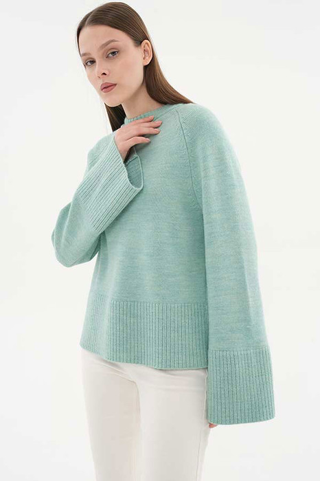 Джемпер свободного силуэта. Длинный рукав-реглан, чуть расширенный книзу. Круглый вырез горловины оформлен резинкой, низ изделия и низ рукава-высокой резинкой. Изделие выполнено из мягкой меланжевой пряжи.