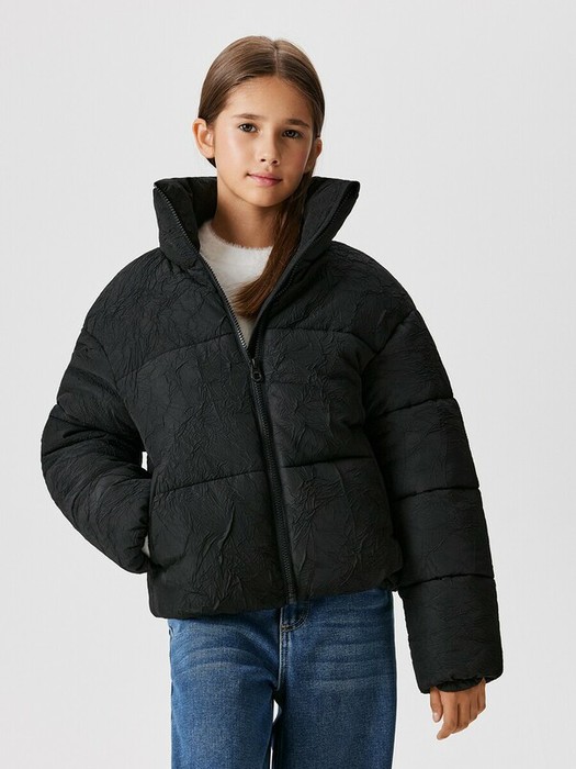 Утеплённая стеганая куртка для девочки из ткани с жатым эффектом и водоотталкивающим покрытием — стильное решение для холодного времени года. Утеплитель — синтепух (вес 350 г/м2) делает комфортным ношение при температуре от +5 до -15 градусов. Подкладка для тела и карманов выполнена из стандартной гладкой подкладочной ткани. Спереди расположена застёжка на молнию с защитой от защемления и внутренней ветрозащитной планкой, предотвращающей продувание. Практичности модели добавляют два кармана c листочкой, в которых удобно хранить перчатки или греть руки. Низ изделия на регулируемой утяжке обеспечивает плотное прилегание к телу и сохранение тепла. Высокий воротник-стойка зарывает горло и избавляет от необходимости носить шарф. Низ рукавов присобран на резинку, чтобы избежать задувания холодного воздуха. Необычный жатый эффект ткани придает модели визуального интереса и вносит стильный акцент в образ. Лаконичная и удобная, черная куртка для девочки станет отличным выбором для стильных образов.